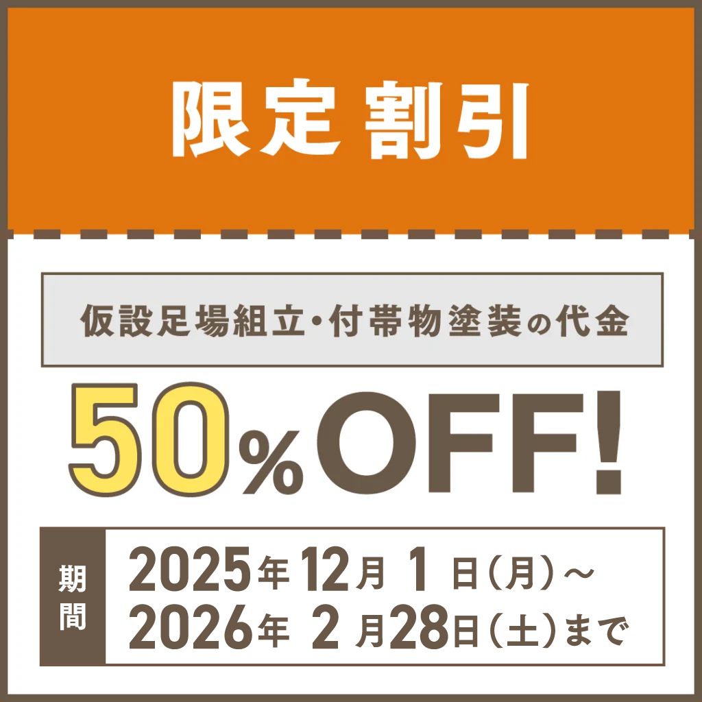 仮設足場組立・付帯物塗装の代金50%OFF(※注1・2・3)