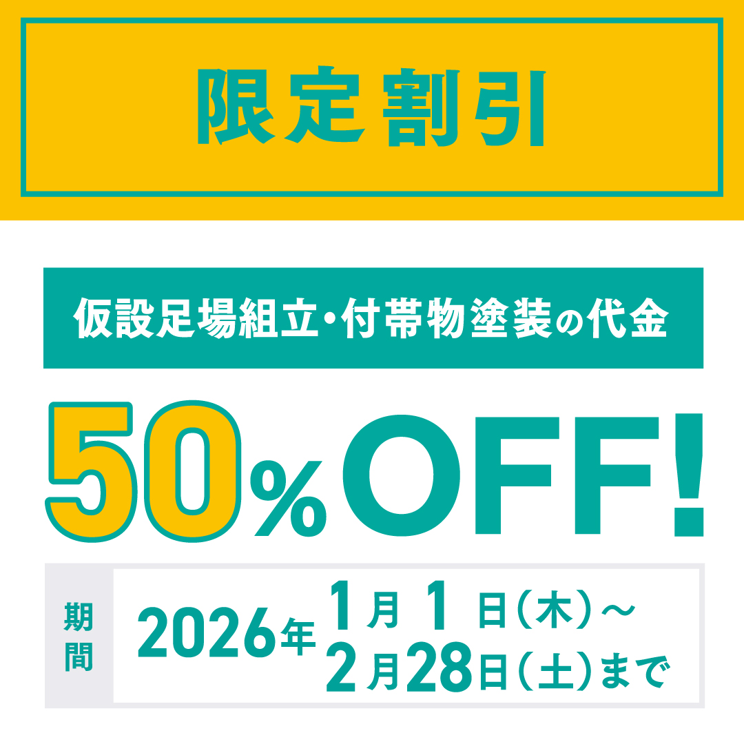 仮設足場組立・付帯物塗装の代金50%OFF(※注1・2・3)
